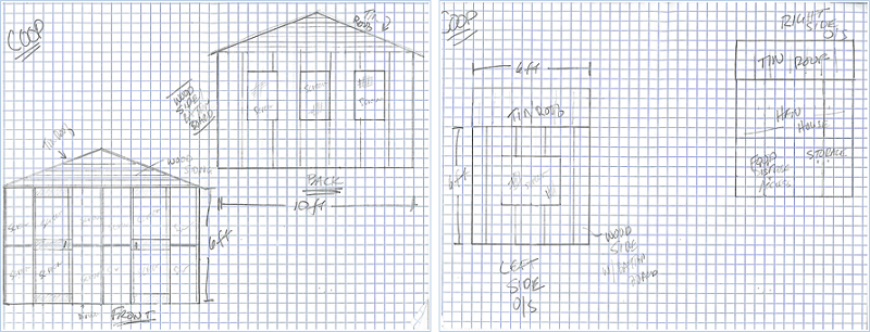 Before I conclude I want to make sure that you don’t think that you have to have fancy plans or drawings to create a great home for your chickens. Sure, you need to have a general idea, but you can do that in a matter of minutes with a pencil and a piece of paper. Here is what I worked from with my amazing handyman friends Ronny & Nick. As you can see, they are very rough sketches. Once we got started some of the dimensions and elements were tweaked a bit, but we knew directionally where we were going…flexing when we needed to.