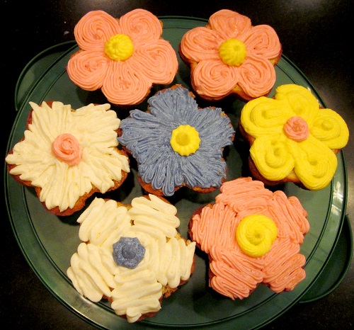 I made cupcakes using a flower shaped cupcake pan from Williams-Sonoma. I don’t know that they sell these anymore, but you might be able to find one on eBay. The cupcakes turned out pretty cute for the novice cake-maker/decorator that I am.