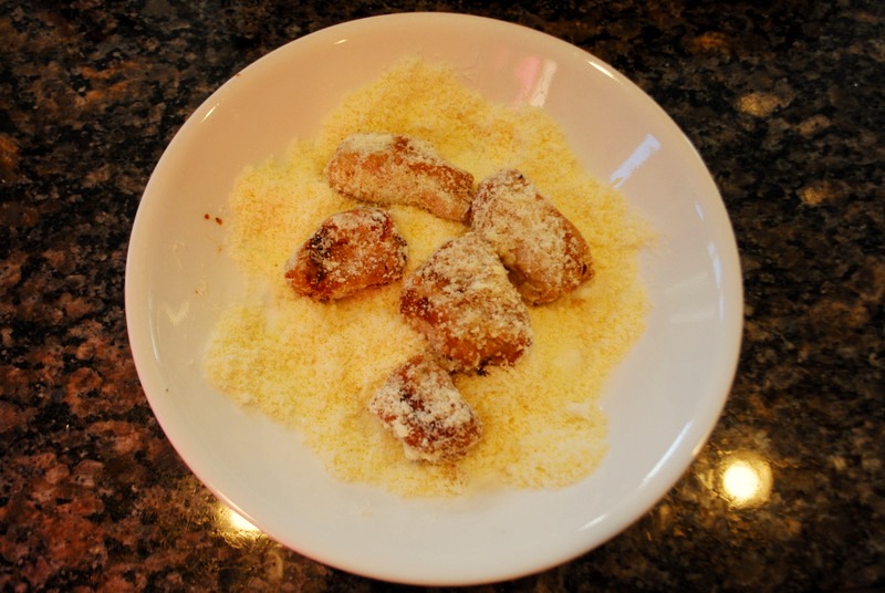 - Remove skewers and toss pork in grated cheese. I really like cheese, so I press it in there to make sure it really sticks.
