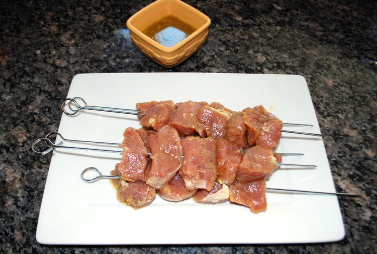 - Skewer your pork and reserve ½ cup of the marinade for basting.